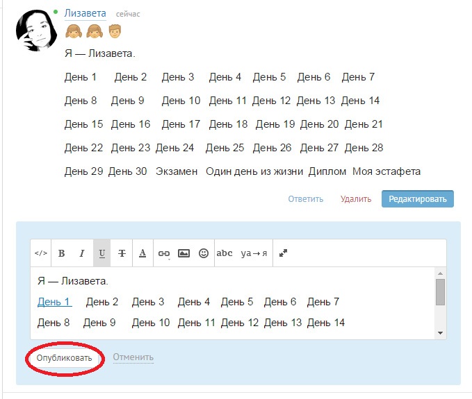 Вы пишите к ней 1 комментарий и добавляете в него ссылки на ваши отчеты ежедневно. Больше ничего сюда не пишите, иначе зачетка из удобного инструмента превратится в обычный пост-болталку.