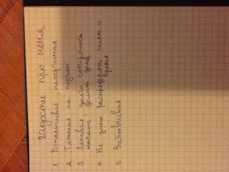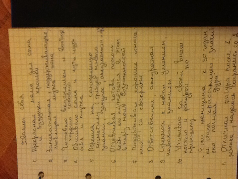 Отчитываемся по заданиямНелегко вспомнить конкретные свои плюсы и минусы, но я начала. Список гадостей про меня 5 пунктов, список похвалы - 11 пунктов. Выложу фото написанного тк долго писать, у меня в планшете дисплей разбит наполовину))