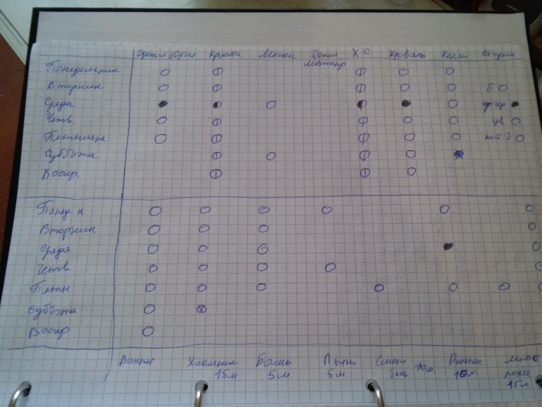 Поэтому нарисовала себе черновичок расписания в КЖ. Подсмотрела идею в болталке о том, что можно отмечать карандашом, а потом просто стирать)