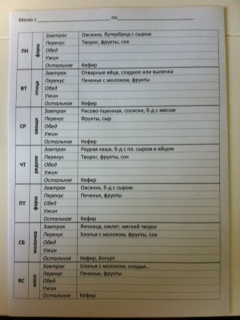 Завтрак, перекус и кефир - фиксированно, а суп и ужин меняются в зависимости от основного блюда )))