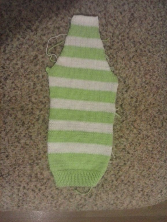 Мало того, что оказалось, что я переборщила и на 20 рядов больше связала, чем нужно, так еще и верх оката был рассчитан неправильно. Опять все пересчитала, связала и он мне кажется каким то узким... Даже не знаю, как с ним быть... Тут такая штука - я хочу, чтобы полосы с полочки и спинки переходили в полосы точно такого же цвета на рукаве. Поэтому высота должна быть именно такая. А вот ширина..... С этим самая большая загвоздка... Как вы думаете, что с ним делать? Отпарить и попытаться вшить такой?