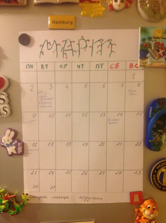 Но вот все правы - холодильник - идеальное место. По-любому пару раз в день волей-неволей заглянет в календарь, привыкнет. Главное - методично и постоянно его заполнять. Я потихоньку начала.
