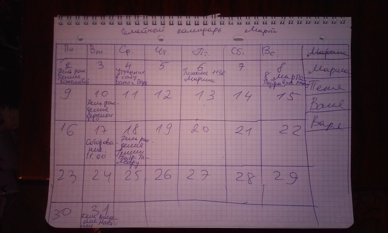 Что касается семейного календаря. Я не любительница досканально все планировать, но считаю что особо важные события записывать по датам нужно. У меня раньше были для этой цели напоминалки на телефоне и стикеры на холодильнике-не эффективно. Часто забываю обновлять информацию. Сегодня просила мужа распечатать мне календарь на март, чтоб заполнить и повесить на холодильник. Но он забыл. Так что я в КЖ сделала набросок такого календаря. Не продумала как лучше по именам разделить, на бумаге не получилось, а в экселе, думаю, осилю такую табличку. Занесла важные события по датам для всей семьи, дни рождения родни и знакомых. Муж планирует свои рабочие дела отдельно, а здесь только семейные мероприятия. Фото прилагается. В конце марта заполню и апрель. Затра муж принесет распечатку, заполню и сфоткаю.