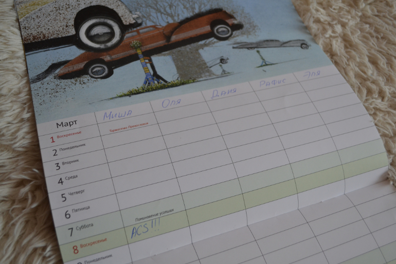 Висит на кухне вместе с ручкой, иначе ее никто искать не будет. Заполнение в процессе))) Т.к. нас пятеро, то дни рождения вписываем прямо в колонку с датой.