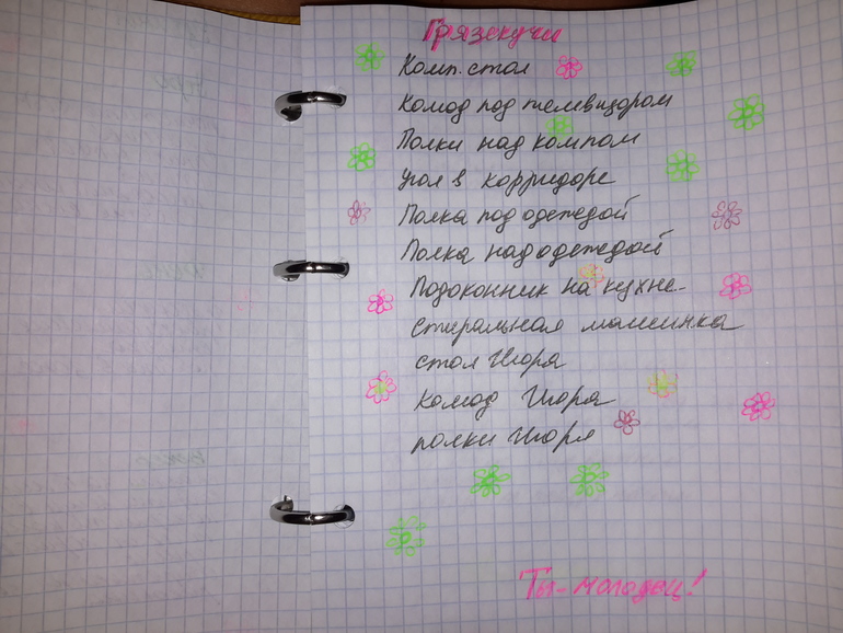 так. я сейчас буду много и сильно ругаться! Саша, что за неуважение? почему ты позволяешь себе постоянно валить все отчеты в кучу? я же не выкладываю вам задания в пятницу, сразу 5 штук, за прошедшую неделю. отчеты не полные. где в рутинах ХС? почему расхламление 15 минут? если мы делаем по 5! куда сразу и расхламление и буги в 1 день? куда дела Келли? почему нет в списке? то есть ты его и не делаешь? почему в зоне нет ни слова о том, что нужно помыть под тяжелыми поверхностями? да-да, это те, для которых нужна помощь (подвинуть кровать, чтобы там помыть. почему список покупок в зоне?ни одного вопроса от тебя, ни одного показанного списка, а в итоге все кувырком. раз ЕЧУ не получается — перепланируй.что значит аптечка хранится плохо? ты ее разобрала?еще раз увижу отчет раз в несколько дней больше проверять не буду.