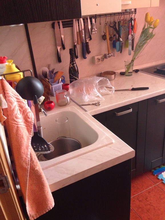 Про старенькое: раковины под контролем, на прогулку не поленилась накраситься и заварила вкусный кофе себе (это про побаловать). 5-минутное спасение перед прогулкой и перед сном, так как заключается в собирании того, что раскидал сын. Хотя сегодня я и кухню спасала, так аак утром было вот что: