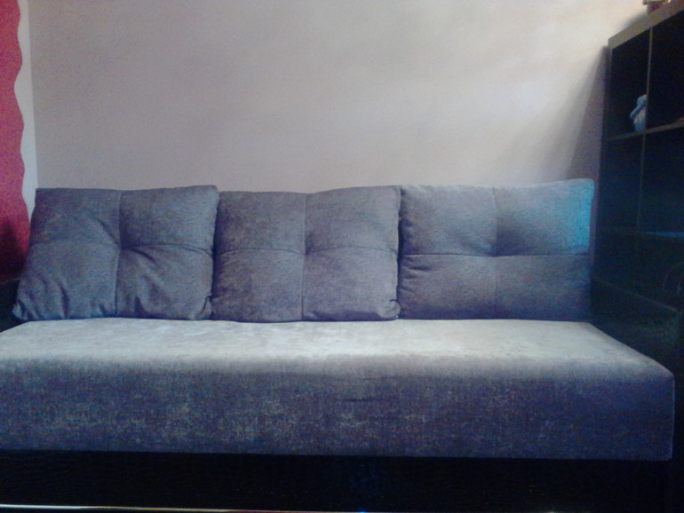 Собрали диван, Ксюша любит его задвигать. Убрали игрушки из ее кроватки и накрыли пледом.
