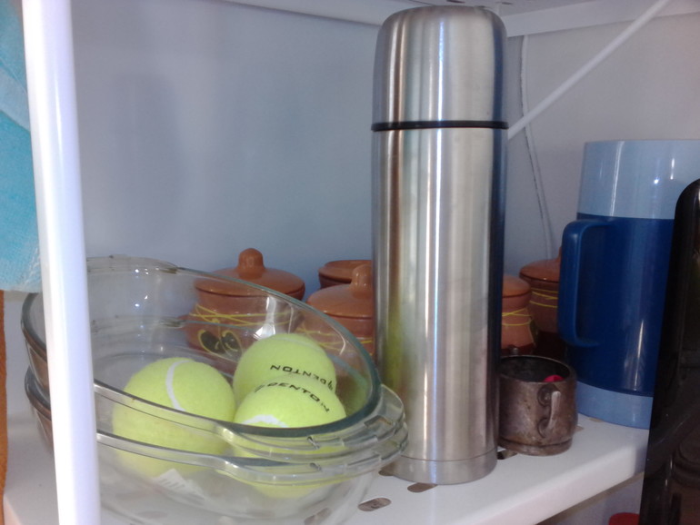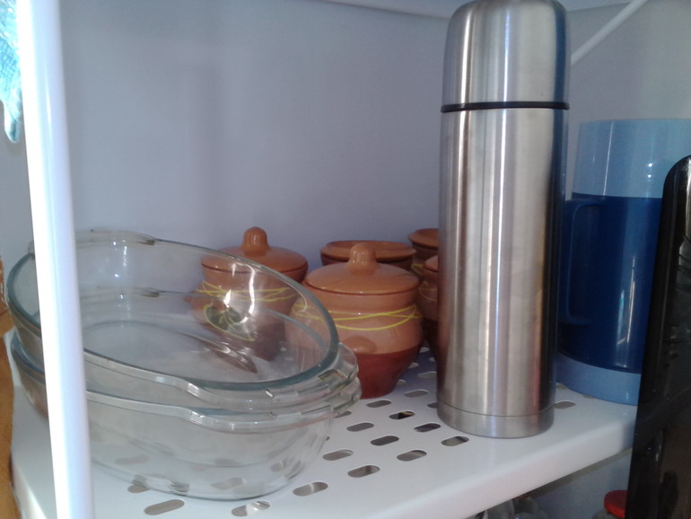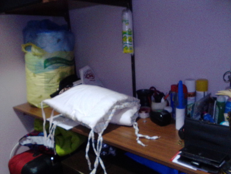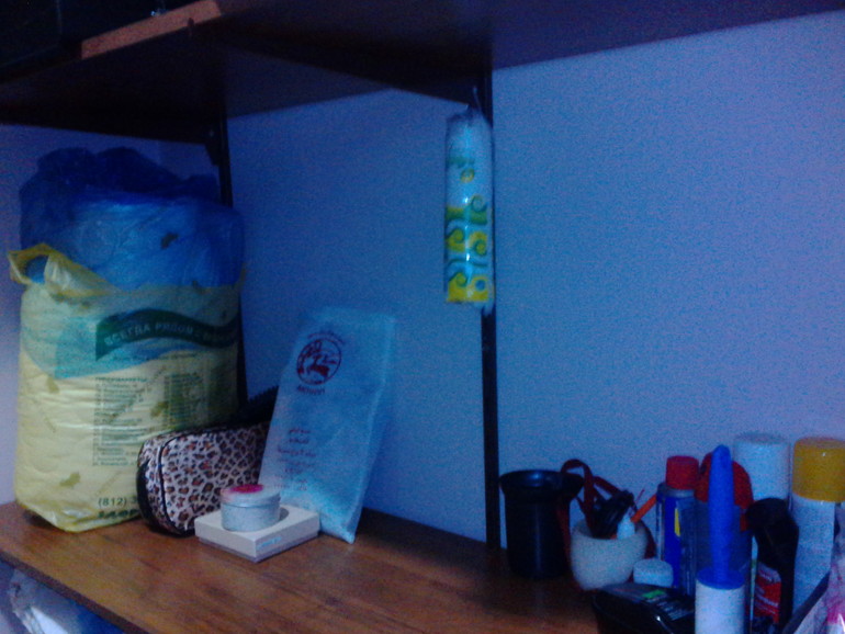 - полка в гардеробе. Одеяло в пакете пока оставила. Думаю, куда его пристроить. Пользовались им пару раз за зиму, под ним очень жарко.