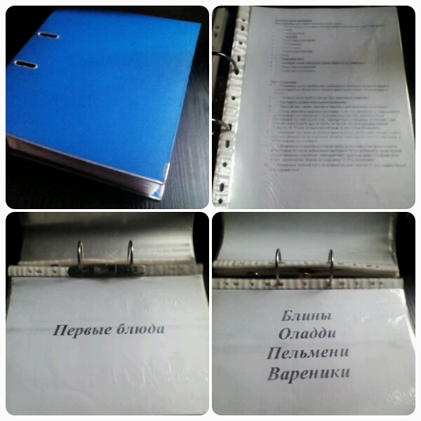 Я несколько раз уже пыталась завести кулинарную книгу, и в тетрадке писала и специальный блокнот для рецептов покупала и на компьюторе создавала, вообщем никак они не прижывались у меня. Но все же я создала, я розпечатала на листах А4, на каждом листе отдельный рецепт, розделила на первые вторые блюда и склала в большую папку каждый раз пополняю.