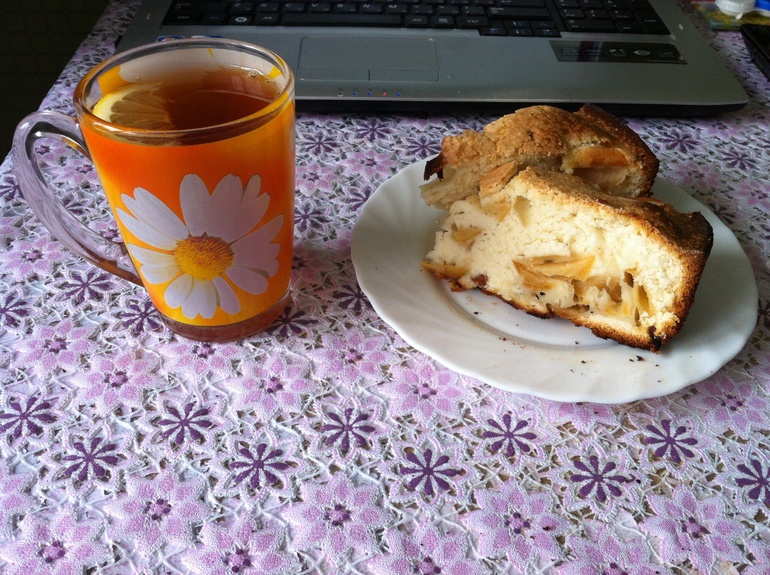 Отчитываемся по заданиямИменно сегодня день выдался очень насыщенным, но все равно опишу его. В 7.45 проснулся сынок, но я была не готова вставать, поэтому взяла малыша к нам на диван и мы проспали до 9.00. 20 минут малыш ползал по нам, обнимались, нежничали в общем. Переодела малыша, ушла умываться. Причесалась, накрасилась, одела чистую футболочку и шортики. 9.30 пошла завтракать. Вчера вечером я испекла шарлотку, поэтому мой завтрак выглядел вот так: