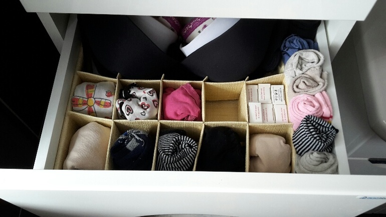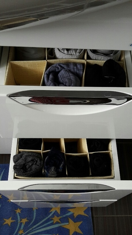 Это я сама сделала. Для детских ящиков заказала готовые органайзеры. В шкаф-купе купила контейнеры, использую уже давно вакуумные пакеты и хочу купить специальные ящики для хранения одежды.