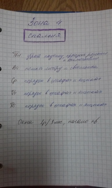 Мне очень понравилась твоя идея составлять не просто список дел в зоне, а дробить по дням неделям. И чтоб наглядней был объем сделала вот такую разбивку на зоны