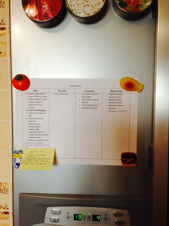 Еще составила для мужчин списки дел по хозяйству. Теперь они с улыбкой подходят к холодильнику и даже кое-что делают :)