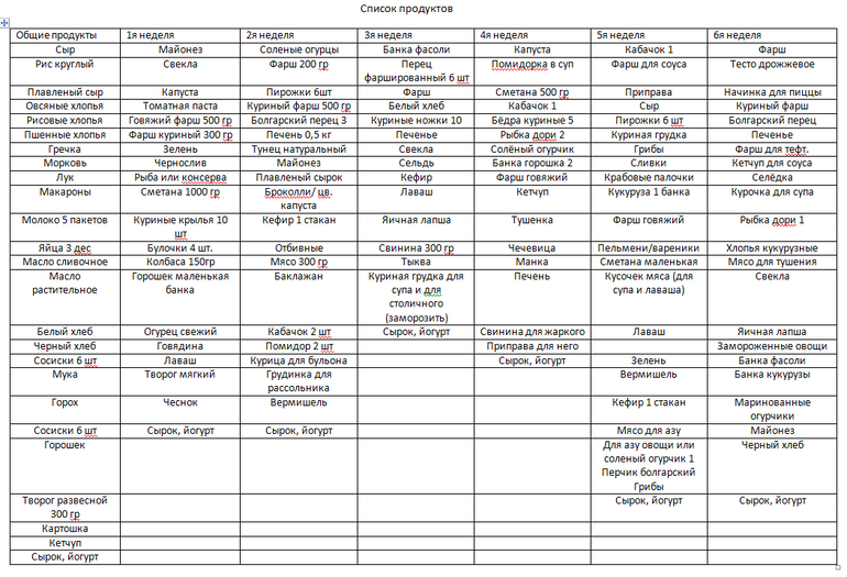 Я составила примерно на полтора месяца, тут же видно, что нужно купить каждую неделю: есть столбик с основными продуктами, а есть те, в которых уже конкретно что нужно докупить для того или иного блюда. Почему именно на такой срок? Во-первых тут уже конкретно блюда. И многие из них я не готова готовить слишком часто - как борщ или щи, например. Так же я считаю, что печень полезна для детей (особенно младшему, у него была анемия), но на каждую неделю её много для нас. Ну и т.п.