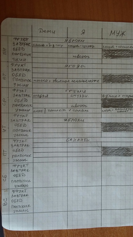 И так, на сегодняшний день мы с вами уже имеем некоторые наброски - БНП по фруктам, завтракам (может у кого-то даже обедам и ужинам), наброски режима питания всех членов семьи, списки основных и любимых блюд. Нам ведь нужно составить не только для себя лично, но и для всех домочадцев с учетом всех интересов.