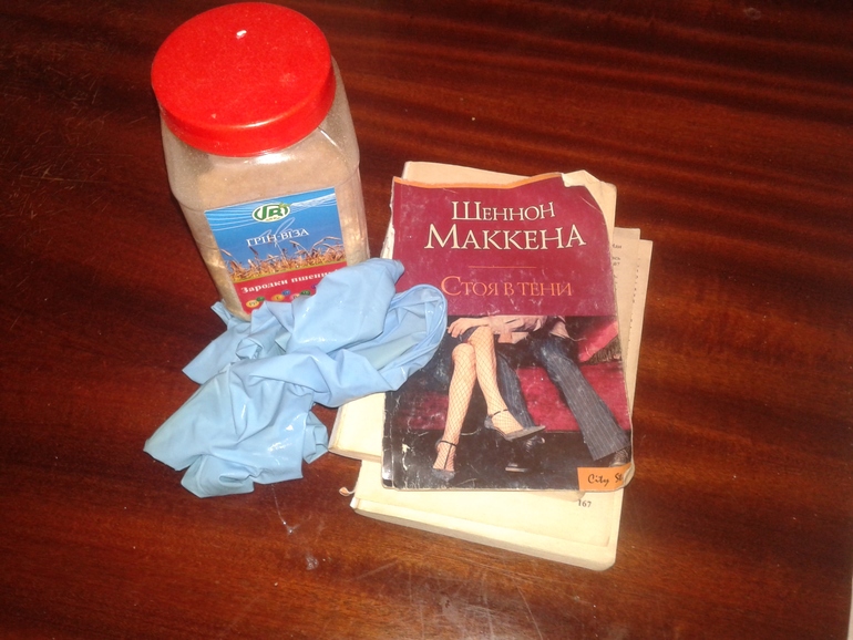 Хлам нашла тут же на кухне: 1. Клетчатка - уже 2 года стоит, 2. перчатки - сегодня ими пользовалась и они где-то продырявились, 3. книга - сто лет назад была принесена на кухню, но так ее и не открыла, а она уже развалилась.