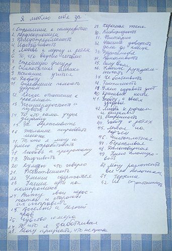 Теперь про списки - похвалить себя оказалось и впрямь довольно непросто, как писали другие девочки, ругать намного легче) Но теперь будем привыкать хвалить себя, тем более негативный список уничтожен, а позитивный переписывается в КЖ)))