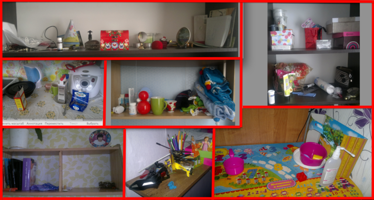 На самом деле их восемь - восьмое фото не вошло - это столик в ванной, где зубная паста, стиральный порошок, игрушки после купания и еще миллион вещей ) Столик оказался чист (вчера его прибрала)
