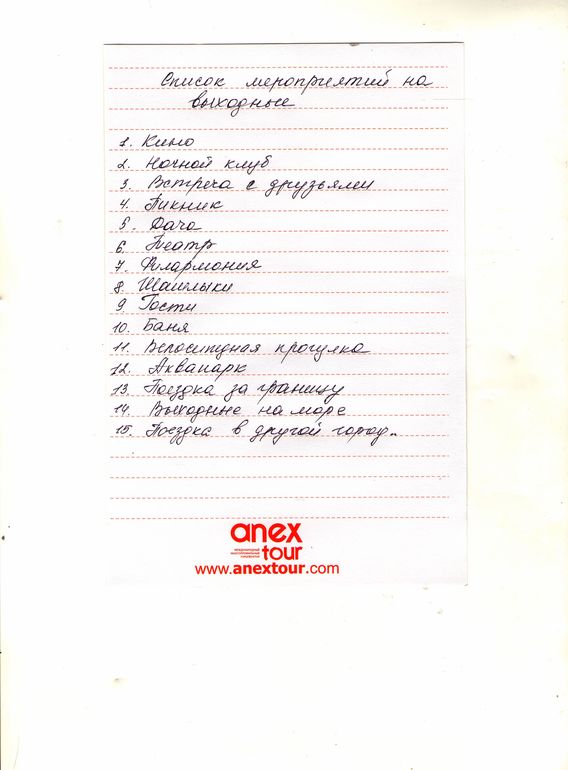 Отчитываемся по заданиямНикогда не задумывалась о выходных в таком ракурсе. Это очень правильно планировать выходные, а то у нас они превращаются в возлежание на диване перед телевизором. Список написался очень быстренько)))