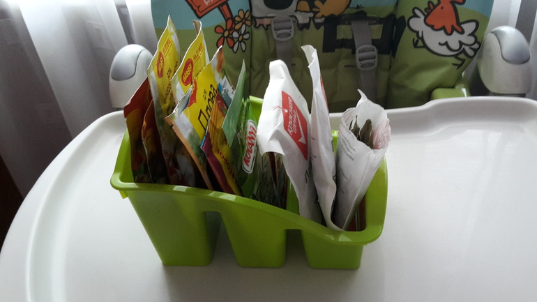 Специй дома немного, раньше хранила в отдельных баночках, теперь купила небольшой лоток лесенкой и ставлю туда пакетики, не пересыпаю по банкам, так занимают они значительно меньше места в шкафу.