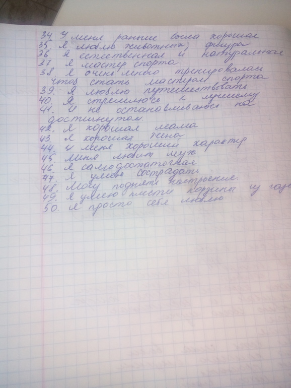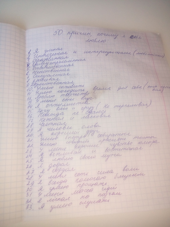 Список с тем, что я не люблю в себе,написала, провала и спустила в унитаз) а с тем за что я себя люблю,ели написала) после 12 пунктов наступил ступор) но все-таки я его осилила