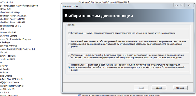 Выбираем продвинутый способ удаления, дальше следуем подсказкам программы. В какой-то момент он вам покажет пункты реестра, относящиеся к программе - удаляем выделенные жирным. Потом он может показать список файлов от этой программы, которые не удалились встроенным инсталлятором - удаляем всё. Но он может и не показать ничего такого - это значит лишь то, что ни пунктов в реестре, ни лишних файлов программа после себя не оставила.
