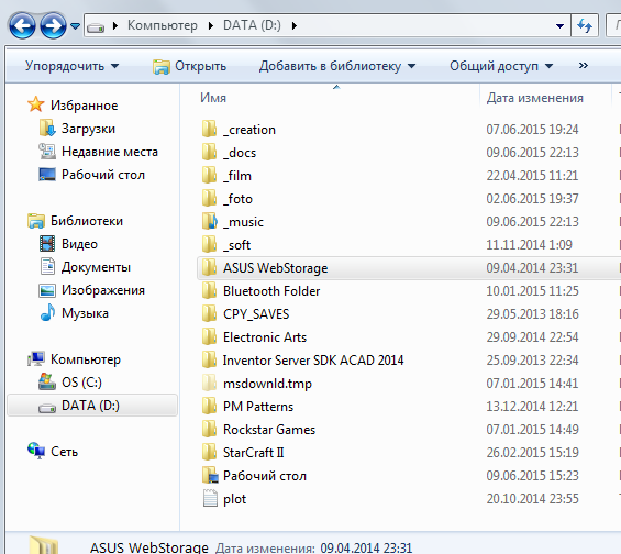 У меня на диске Dесть шесть папок-категорий. Как видно из скриншота, они там не одни, там еще куча папок, которые создают разнообразные программы. От них никуда не деться, а потому свои папки я называю латинскими буквами и с нижним подчеркиванием в начале. Это позволяет им оставаться всегда в начале списка.