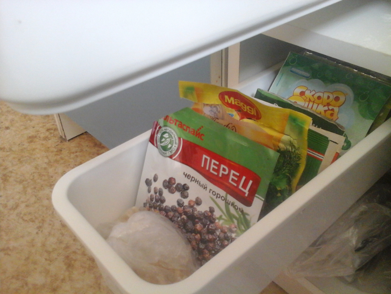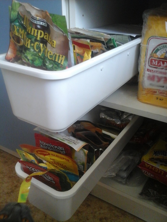 Особо разницы нет, зато полочки помыла) и еще специи, которые на виду (фото только "после", "до" все время забываю). Полочки и баночки легко отмылись меламиновой губкой.