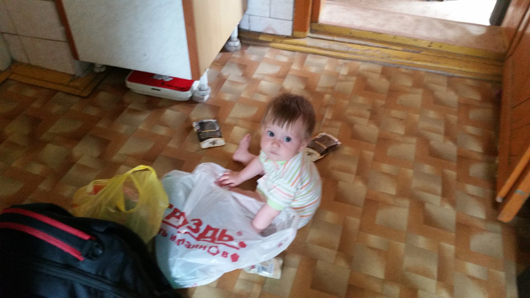 Пока вика ползает, я попила чай и попыталась снова привести зал в божеский вид, поскольку должна прийти массажистка. Пока я пыталась убрать со стола и подготовить его под массаж, Викуличка залезла в еду кошки, разлила воду по кухне из миски кошки, "помогла" разобрать мне пакеты с покупками.