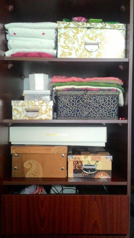В 1 большой кофр вошли все вещи, которые по всей полке "размазаны" были. Освободилось место. Я смогла туда поместить вещи, которые на глазах лежали, а требуются не всегда. В общем визуально - все аккуратненько. Да и функционально - это мега-приспособление.