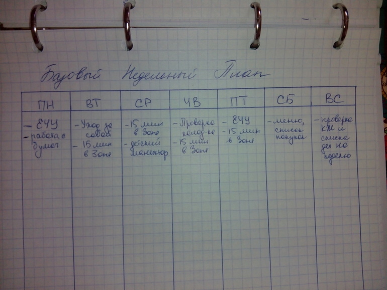 В моем случае все осложняется тем, что у мужа выходные меняются каждый месяц, да и в течении недели могут поменяться. Поэтому я предпочитаю это не планировать, а просто подстраиваться под мужа. Другого выхода у нас нет.Поэтому именно эти пункты у меня не получается внести в БНП. Я просто буду в воскресенье корректировать свои дела на всю неделю при необходимости. Это я внесла в БНП. Все остальное, что записано в БПН будет статично, независимо от выходных.