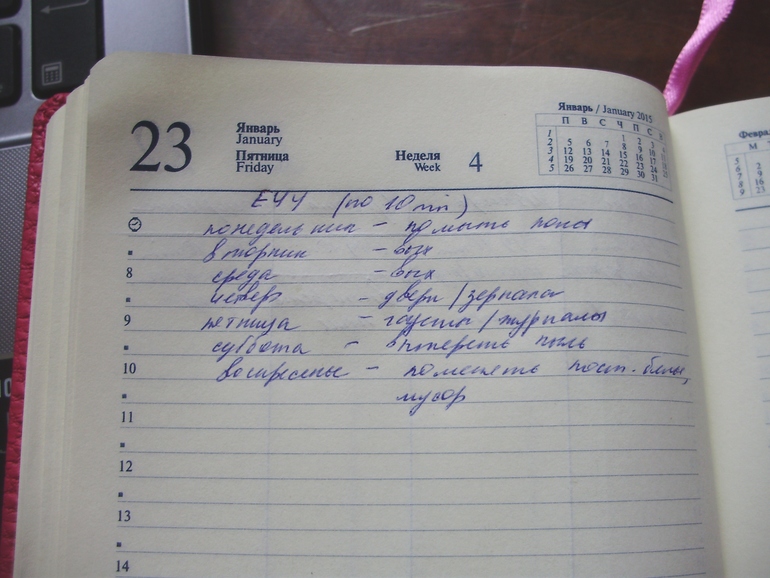 Отчитываемся по заданиямЕЧУ разбила на 5 дней чтобы проще было выделить время, посмотрю на удобство такого варианта, может изменю потом на 2 раза, к примеру. На один день все боюсь оставлять чтобы не сорваться, мало ли какие дела в этот день будут, может когда научусь все делать очень быстро) сделаю и один
