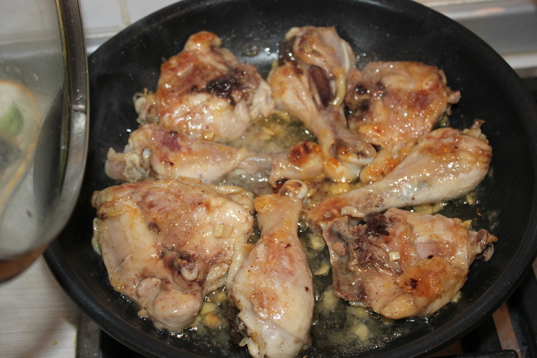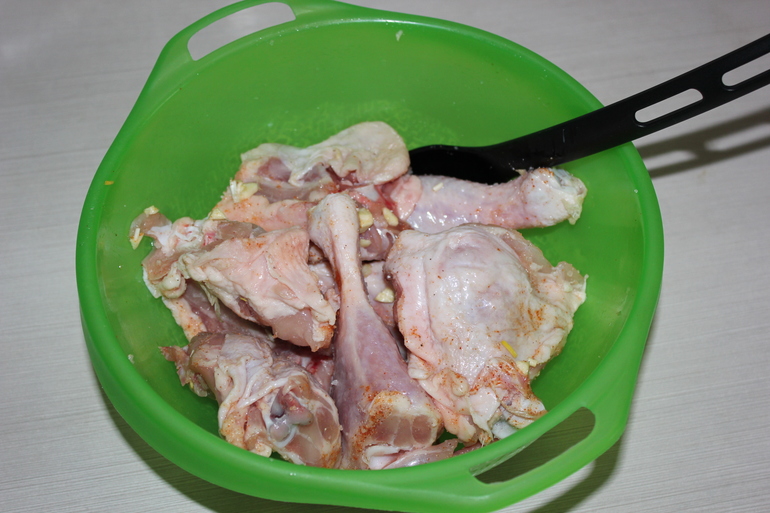 Курочка уже разморозилась, я разделяю ее на порционные куски и мариную.