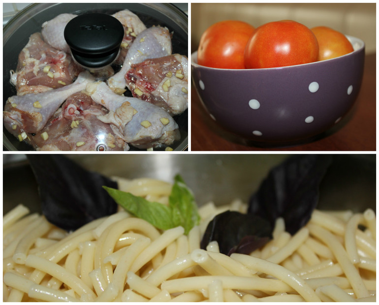 К курочке у нас сегодня макароны и салатик из помидоров (это у моей мамы на даче они уже краснеют)