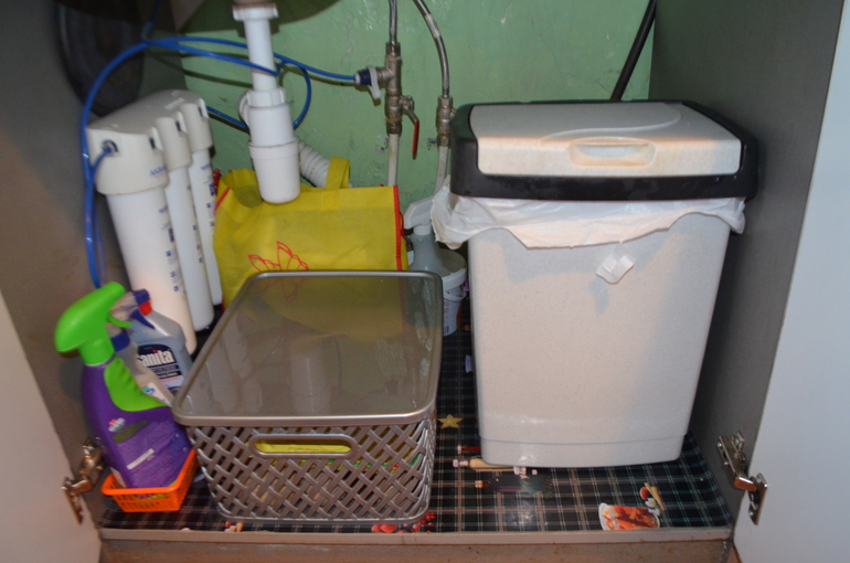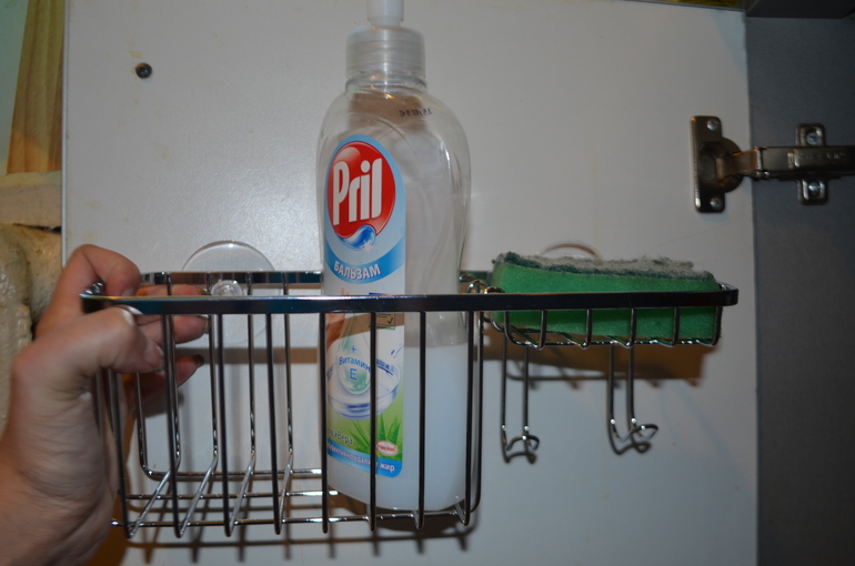 Съездила в магазин, купила контейнер для картошки, контейнер для редко используемых моющих, и полочку на дверку для губки и средства для мытья посуды. Полочку пока прикрутить некому, завтра прикрутят, на липучках она не держится.