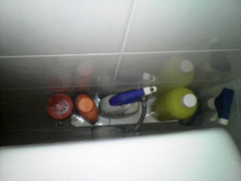 Сорри за качество,фото с телефона.Я навела там порядок,выкинула полупустые бутылки и переставила все за бачок унитаза,там у нас есть полочка.Стало под раковиной красиво)))