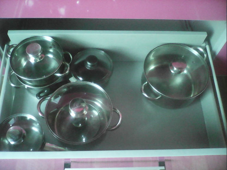 В кастрюлях у меня полный порядок, все новые, и как раз столько, сколько нужно. Пользуюсь ими уже год, все устраивает. Записала в список покупок полку для крышек.
