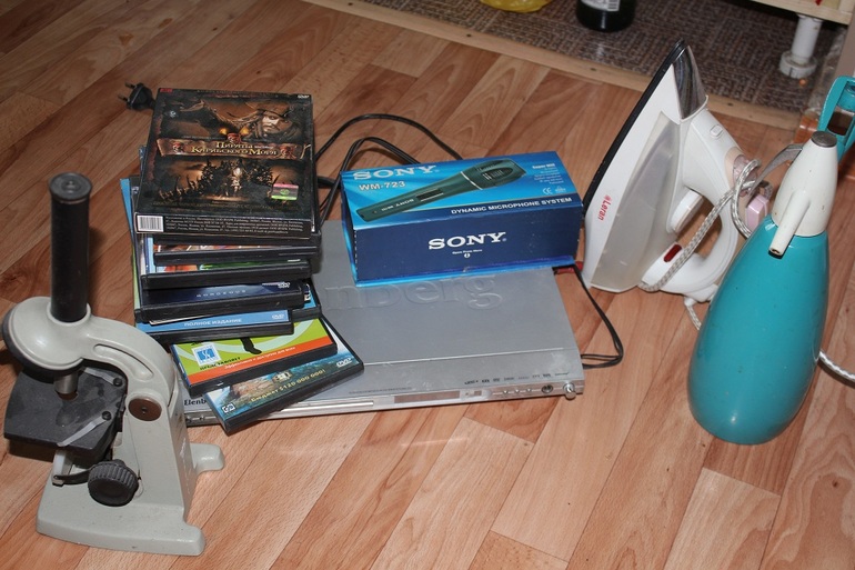 Отчитываемся по заданиямИ отчет по третьему дню. Это круто))) Все на фото. Сифон, представляете какой раритет, к сожалению резинки рассохлись-не работает. На помойку. Микроскоп, реально плохой микроскоп, как биолог говорю, на помойку. Утюг не работает, муж клянется что починит, оставила в коробке с вопросительным знаком на время марафона, потом буду коробки выбрасывать, если утюг там еще будет то вместе с ним. И главное, абсолютно рабочий хороший дивидишник. Договорилась с детским домом, я ними сотрудничаю, у них вчера сломался дивиди, а сегодня я позвонила и преложила им, они от радости прыгали, это классно. Ну и заодно к нему куча классных дисков, тех которые много лет не могла выбросить потому как есть коллекционные издания, ну и микрофон для караоке. Пусть поют. Завтра на 9 утра договорились, сама отвезу. Ура-ура.