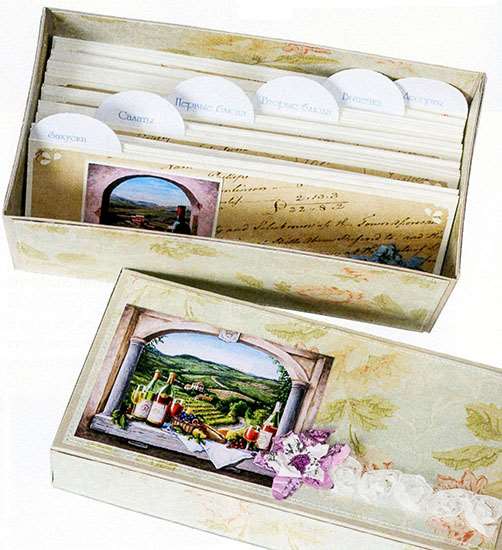 Тетради мне неудобны. Я очень долго думала, чего же хочу. В итоге остановилась на коробке для рецептов. Заказала ее еще в июне, но по ряду причин получу готовую только к 20му августу. Потом похвастаюсь. А пока приблизительное фото из интернета, что у меня будет (только крышка будет не съемная):