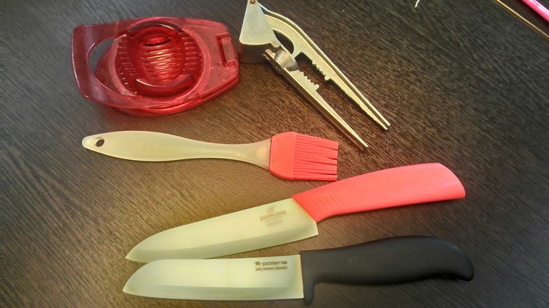 . Без этого я не представляю свою кухню - хлебопечь, миксер и погружной блендер, сфотала только те насадки, которыми действительно пользуюсь. Керамические ножи - очень полезная вещь в хозяйстве! Так же часто меня выручают - яйцерезка, пресс для чеснока и силиконовая кисть (я ей масло размазываю