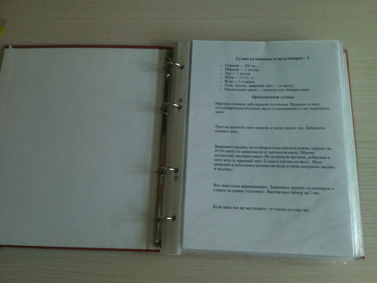 Тетрадь на кольцах у меня есть уже давно, несколько лет. Сначала рецепты писала от руки, потом лень-матушка меня победила и я стала их распечатывать и вкладывать в прозрачные файлики. Оказалось очень удобно - можно "отстегнуть" нужный рецепт и не выкладывать целую тетрадь. Плюс следы от муки, жира легко отмываются от файла, сам рецепт можно не бояться намочить.