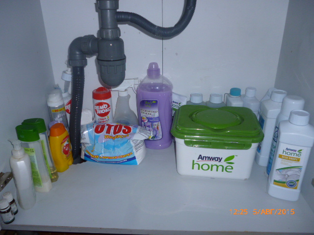 Поряяядочек какой! Я люблю, когда по размерам, цветам все выставлено!))) Тебе под раковину выдвижную корзинку надо пристроить, по размерам твоих бутылок прямо идеально будет!