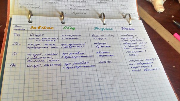 Вот что у меня получилось. Написала меню на 4 дня, включая сегодняшний. Учитывая имеющиеся продукты. На понедельник уже запланирована поездка в город за продуктами, так что на следующую неделю меню буду писать потом, исходя из ситуации.