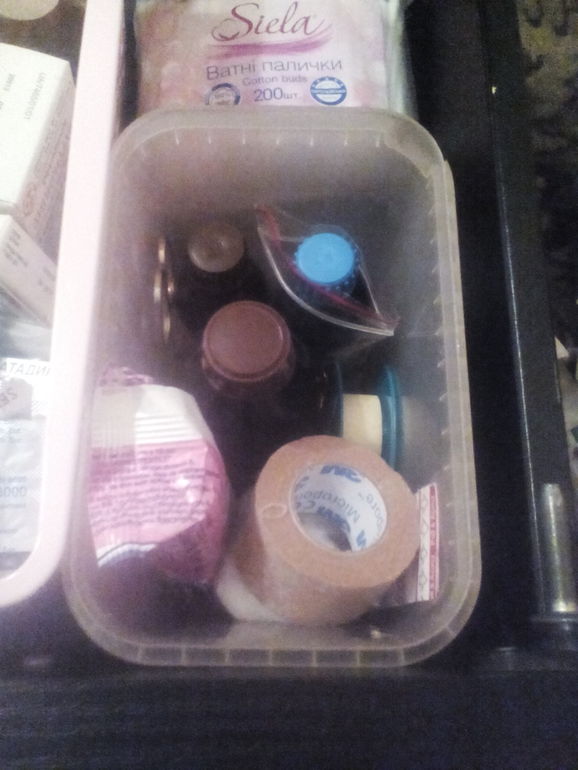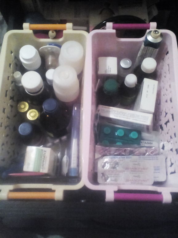 Я разобрала на детские и взрослые препараты. И отдельно в маленьком контейнере собрала для первой помощи ( бынт, вата, йод, зеленка, пластырь).