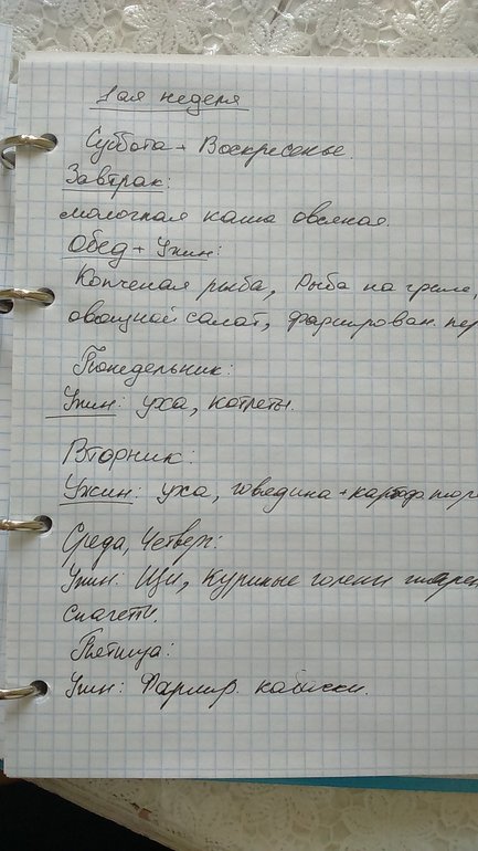Отчитываемся по заданиямСоставила меню, мужу главное супчик. Ребенок после садика кушает фрукты и пъет молоко с баранкой. На выходные едем на дачу, по этому и написано что будет в холодильнике, а кто что когда будет кушать мне не известно