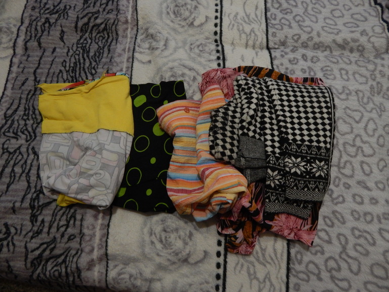 Привет. Так как живу в общежитии в одной комнате, то у меня одна антрисоль, нет ни полок, ни кладовок. Я там храню зимние вещи. На отдачу нашла вещи: платье, туника, теплые легинсы, бриджи.