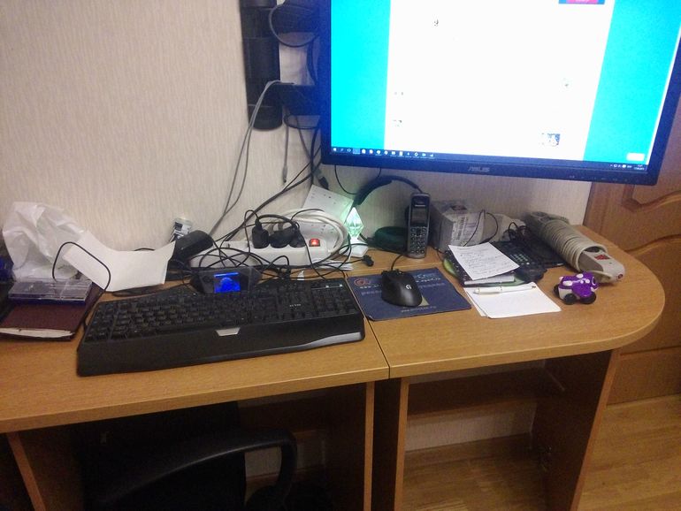 1. Компьютерный стол. Тут муж - царь и бог. Поэтому большинство вещей, к сожалению, я убрать не могу без его разрешения. А муж, увы, живет по принципу "если это тут лежит, пусть лежит, вдруг пригодится". В общем, убрала что могла, из своего хлама - иногда бросаю по пути в детскую что-то и забываю.