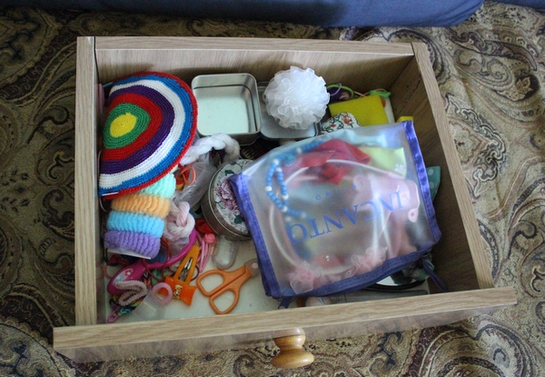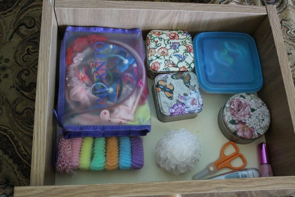 Разобрала детские выдвижные ящики. В одном хранились аксессуары. Раньше там был порядок. Пока я пару раз не повелась на просьбу достать им ящик. После этого я там разобраться никак не могла собраться. Но глаза боятся, а руки делают.