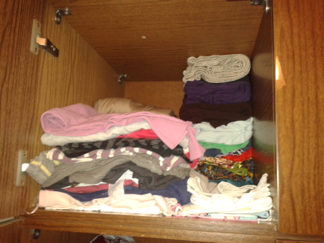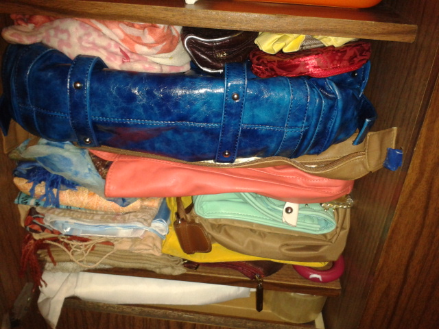 Еще разобрала-проверила полку с шарфами и сумками - пару платков отдала маме. Но в целом полка еще сильно забита - пока не решила как лучше ее обустроить - буду думать над этим. Ну хотя бы порядок на ней (хоть и плотный)) ).