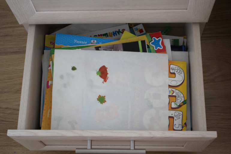 Теперь там пустота в 2 ящиках. Раздумываю, что туда положить:) Книжки и развивашки переехали в дочину комнату.